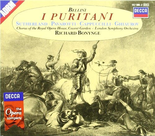 Bellini's final opera, I Puritani, is frankly a bit of a mess with its heroine slipping into insanity no less then three times. But the music is glorious - Bellini's use of cantilenas developed to a point that rivaled Verdi in the latter's finest moments. The singer demands are outrageous, nevertheless a couple of good recordings exist. Callas has high marks but includes performance cuts and a mono recording; more recent contenders are Muti (with Caballe and Kraus) and this one, Sutherland's second. Everybody is really good here, but Sutherland herself doesn't sound fully committed and that is a big minus. The reason this is a must have, is Pavarotti: he throws around high Cs and Ds here, and even hits F.